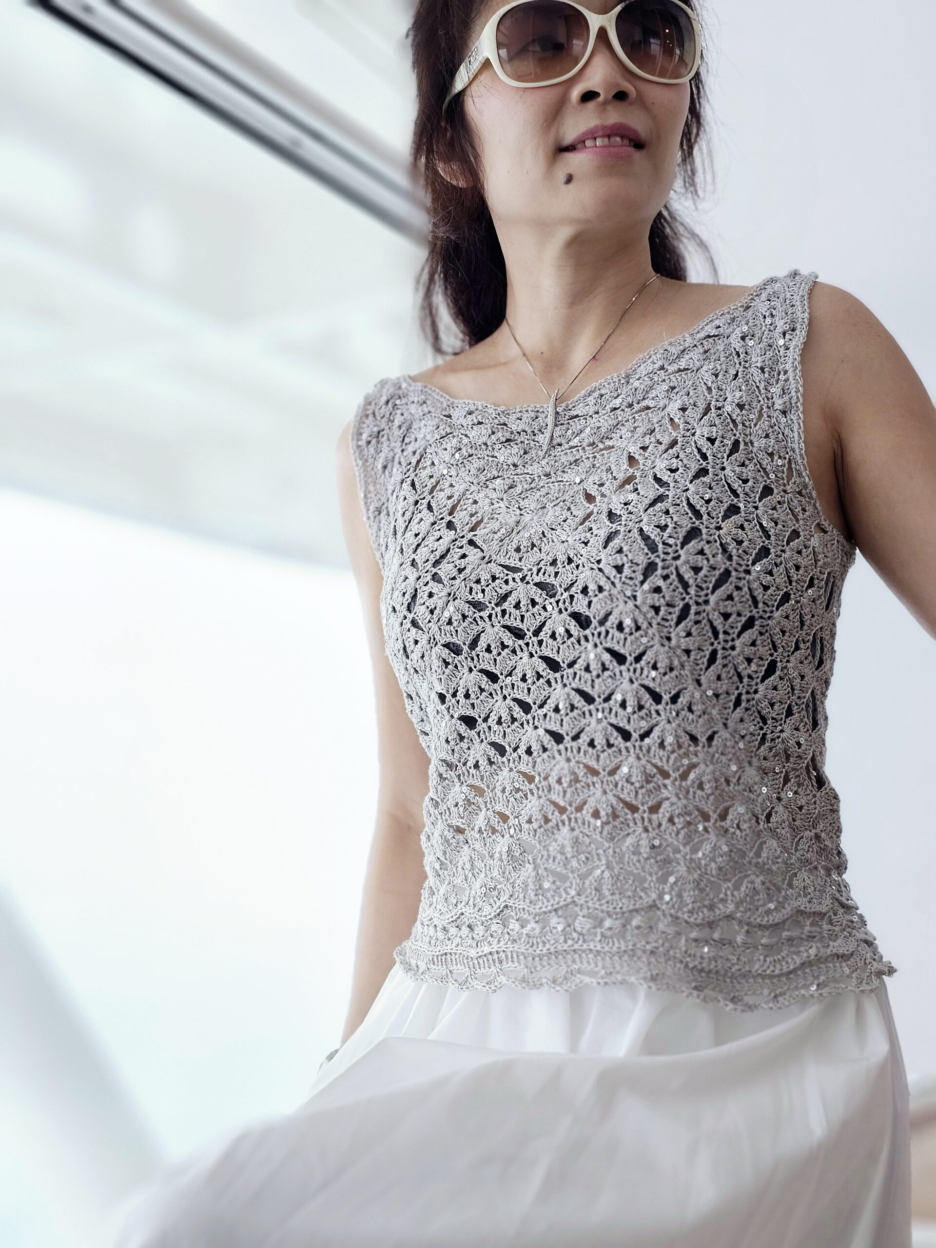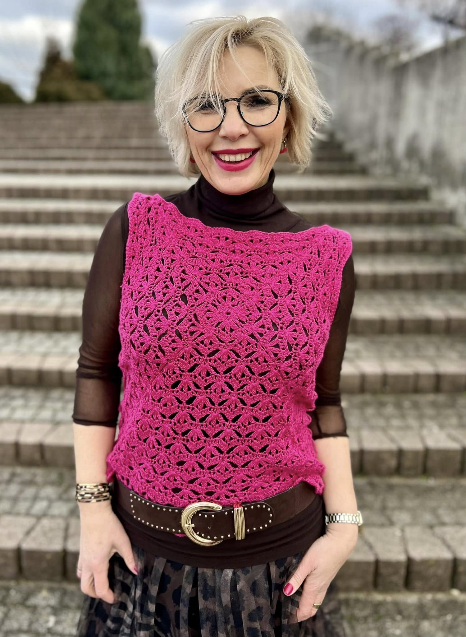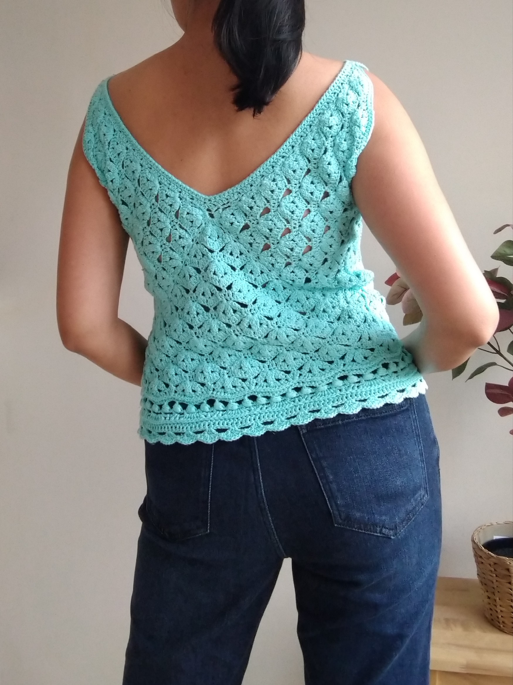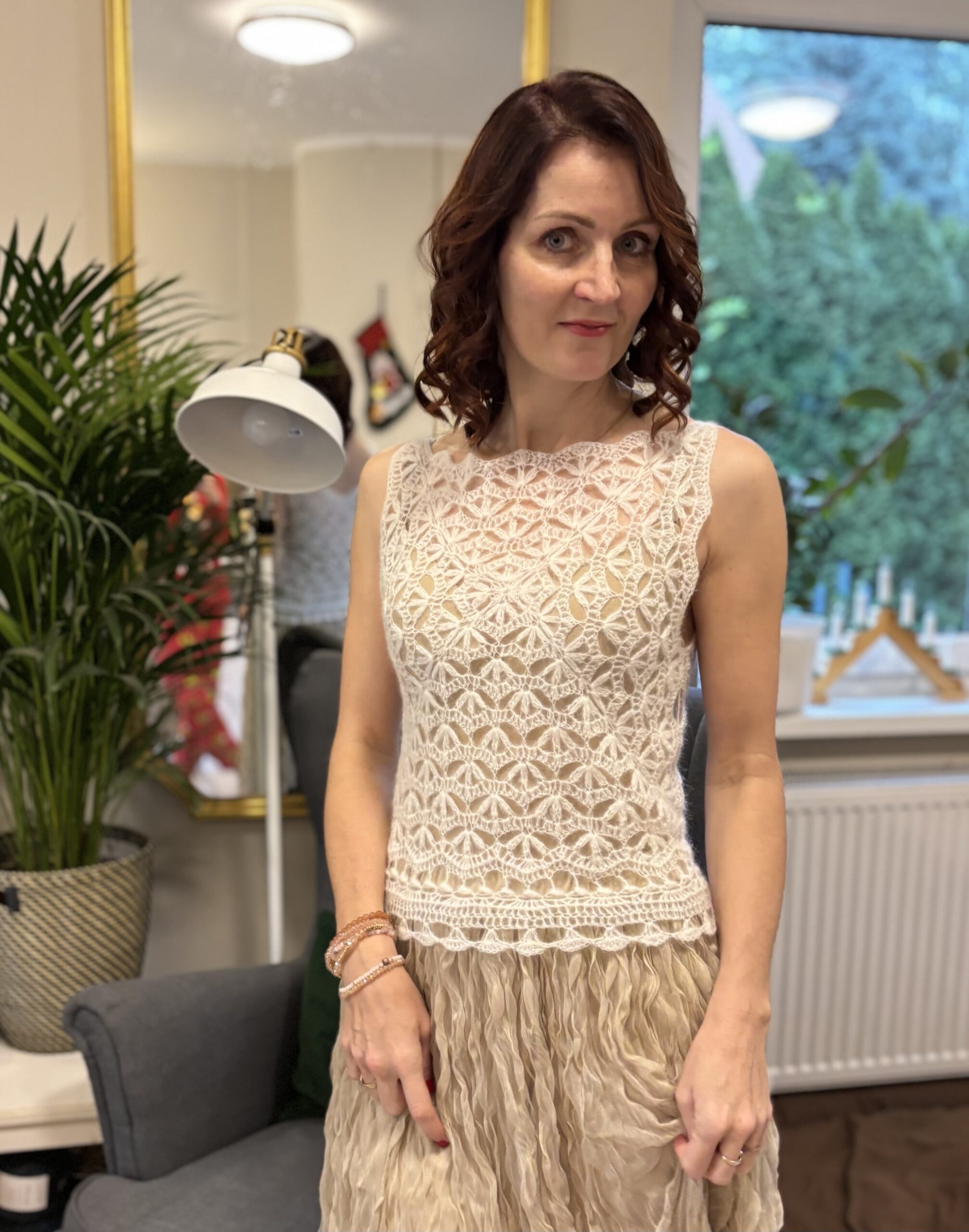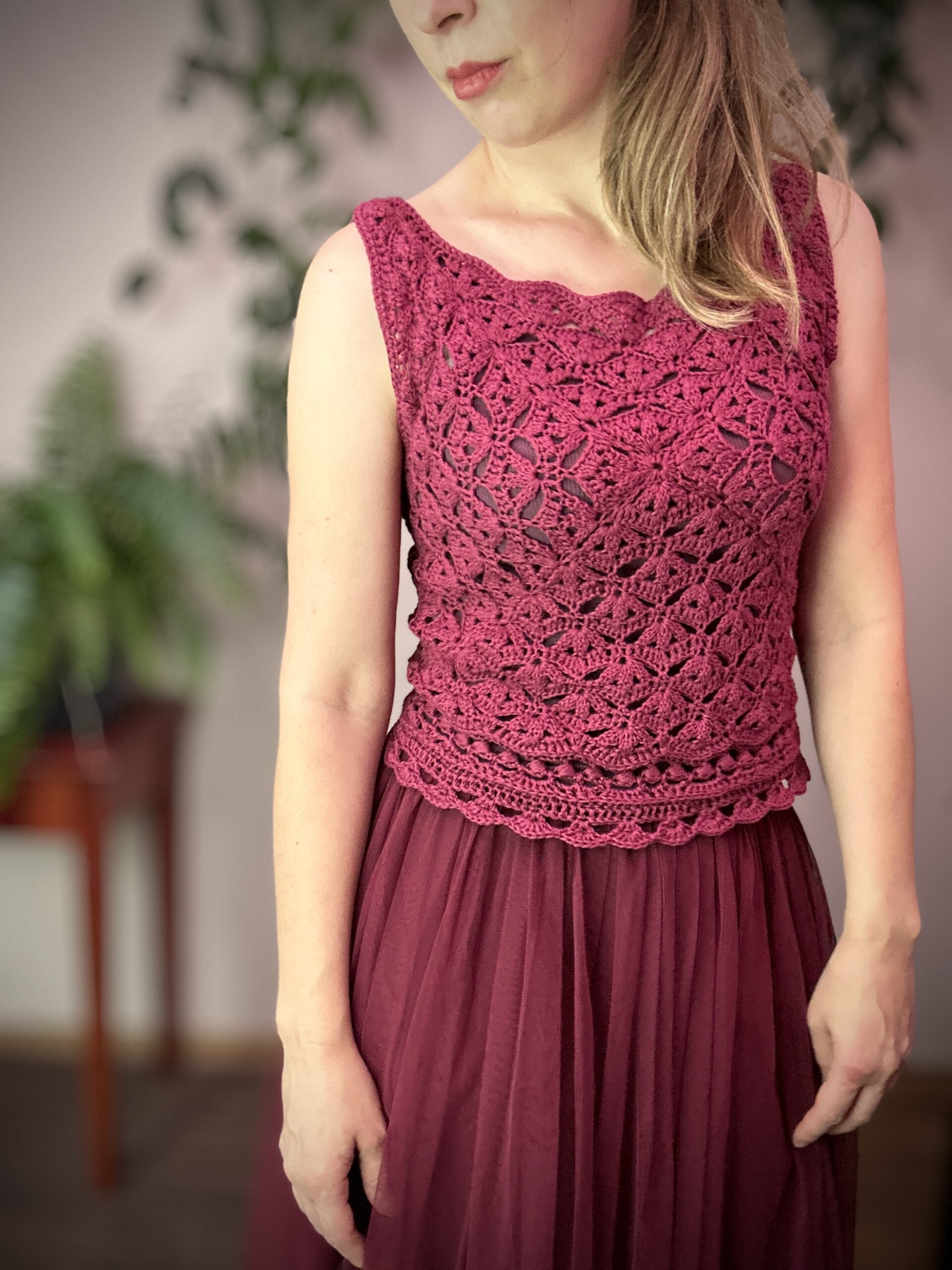 The Audrey top is made using the ’made-to-measure’ technique. It is worked from the inside out, in two square panels that differ in neckline type. You adjust the width and length during the process by adding rounds.The front and back panels can be swapped, or you can make them identical.
