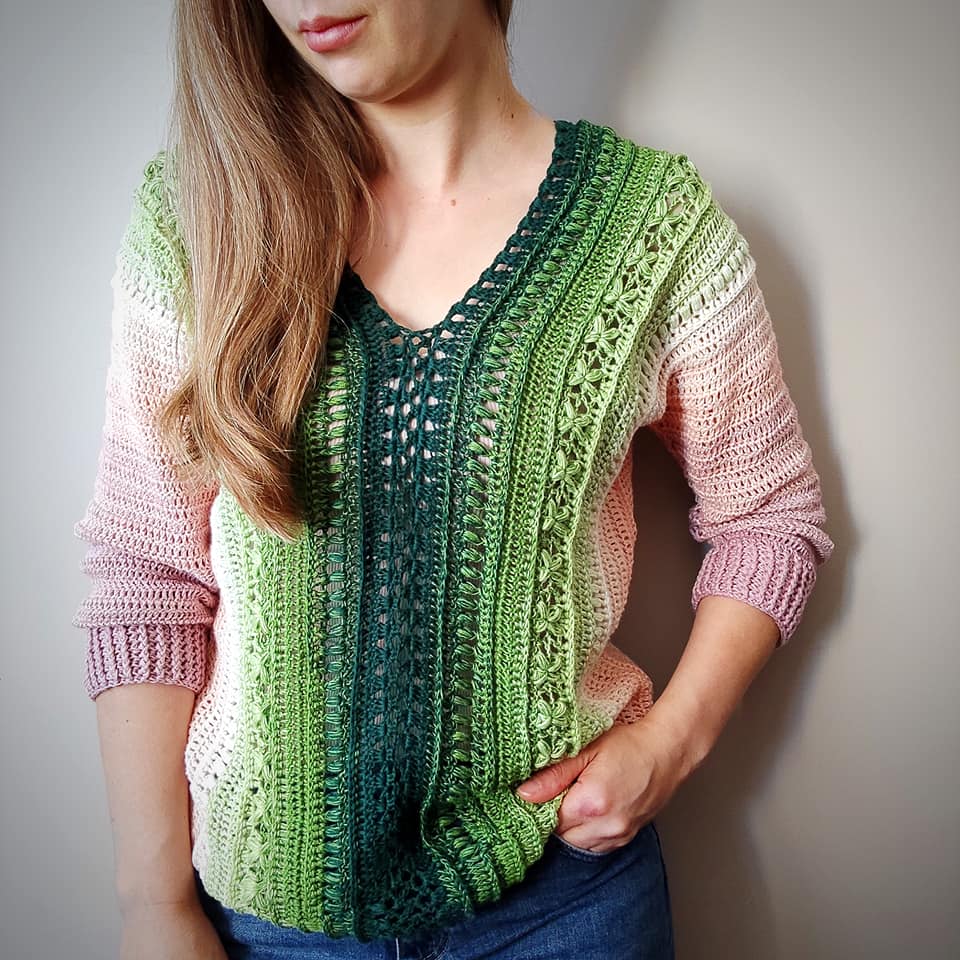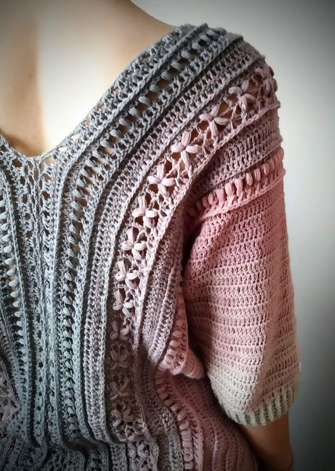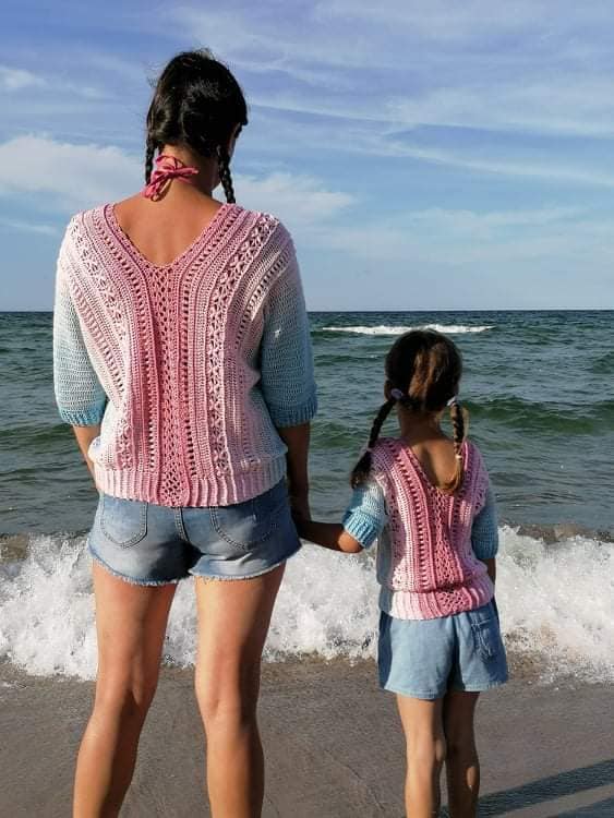 Rozmiar dopasowuje się przez dorabianie odpowiedniej ilości rzędów na szerokość. Następnie dorabia się rękawy bezpośrednio do tułowania.
